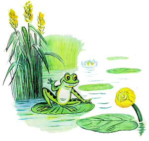 Но больше всего на свете Ква-ка любил петь. Все свободное время он распевал песни. Правда, поговаривали, что ему большой Карп на ухо наступил, но лягушонка это не смущало. Он мог с утра до ночи горланить свои песенки: