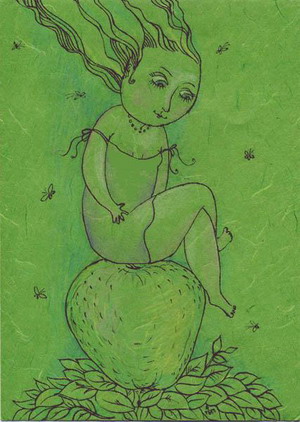 Она, очарованная любимой мелодией, присаживается за стол, её рука медленно тянется к вазе с яблоками…