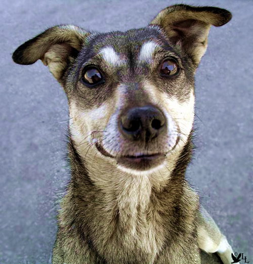На этот раз я остановила свой взгляд на весёлой «картинке»: современное здание какого-то банка, отделанное по фасаду особым тёмным пластиком с зеркальным покрытием. На входных ступеньках стояла довольно крупная собака, пегая дворняга – помесь овчарки с беспородным псом из любой подворотни. Она поставила свои передние лапы на верхнюю ступеньку и внимательно смотрела прямо перед собой. Заметив там своё отражение, она некоторое время всматривалась в него, потом стала поднимать по очереди одну лапу за другой, как бы убеждаясь, что это она видна в отражении. Она не принюхивалась и не проявляла агрессии. Было видно, что она просто смотрится в зеркало, точно понимая, что это, именно, она и есть. Я тихонько стояла и смотрела на эту немую сцену, пока собака не учуяла меня и не обернулась. То, что я увидела, заставило меня засмеяться. Она не спеша повернула ко мне голову, приподняв только одно ухо, как бы спрашивая меня всем своим видом: «Ну как тебе это зрелище?» При этом на её «лице» появилась настоящая улыбка, с какой, обычно, изображают на картинках знаменитого «чеширского» кота.