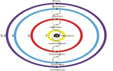 Комментарий автора: На иллюстрации по вертикали вверх показан переход от тонких частиц, не имеющих массу и материи к материальным частицам этого мира. По вертикали вниз – тоже, но антимира. По горизонтали – ритмический ряд преобразования духовных миров в материальные.
