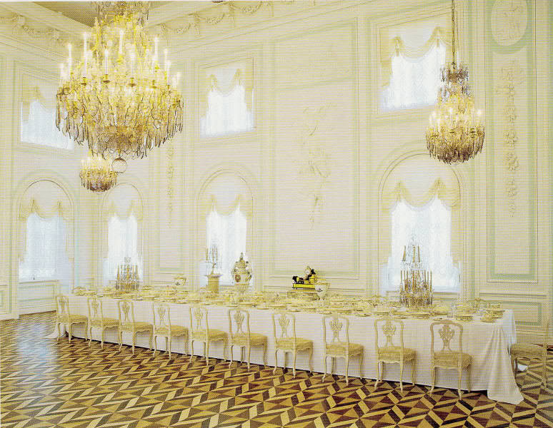 Изрядно подустав, мы зашли в сам дворец, где нам предложили обуть огромные «тапочки» и мы «поплыли» в них по прекрасным залам. Осмотр начался с Дубового кабинета Петра I. Кабинет назывался так, потому что основным его отделочным материал был дуб, а также и его узорный паркет составлен из разных пород дуба. Затем мы перешли в картинный зал, все стены которого увешены были портретами красивых девушек. Все залы были украшены лепниной покрытой позолотой, которая блестела и отражалась в многочисленных зеркалах. Куропаточная гостиная и китайская комната поражали своими цветовыми гаммами, казалось, мои глаза не вместят такого множества красоты. Я уже была переполнена обилием красок и блеска.