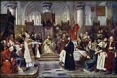 В те времена такой приговор вызывал всеобщее беспокойство. Совершаемые при этом церемонии были рассчитаны на то, чтобы как можно сильнее запугать народ, который смотрел на папу как на наместника Бога, имеющего ключи от неба и ада и обладающего властью вершить как гражданские, так и церковные суды. Люди верили, что врата неба закрыты для тех, кто подвергся отлучению, и до тех пор, пока папа не отменит это наказание, мертвым не будет доступа в рай. В знак этого страшного несчастья все богослужения были прекращены, церкви закрыты, и свадебные церемонии совершались на церковных дворах. Умерших было запрещено хоронить на освященной земле, и без каких-либо обрядов их зарывали где придется. Вот такими методами, действующими на воображение обывателей, Рим пытался подчинить себе людей.